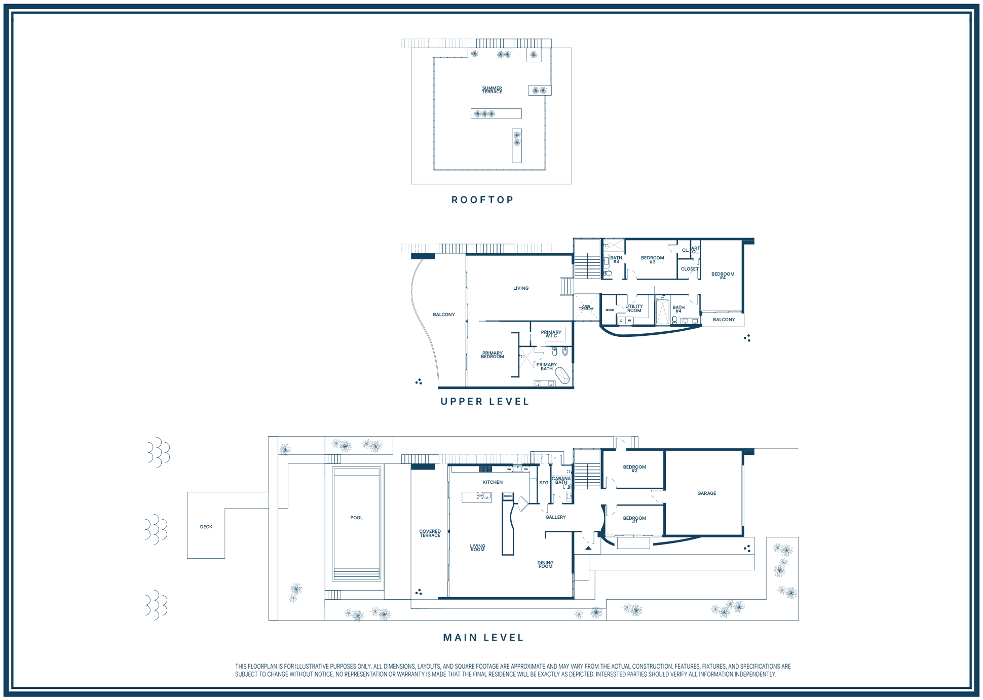The upper level offers a spacious family lounge and a tranquil primary suite with spa-style bath and custom walk-in closets, while a private VIP guest suite and additional bedrooms provide flexibility and comfort. Outdoor living is elevated with a saltwater infinity pool, multiple dining and lounge areas, direct water access, and a spectacular rooftop terrace with wet bar, hot tub, and panoramic views.
